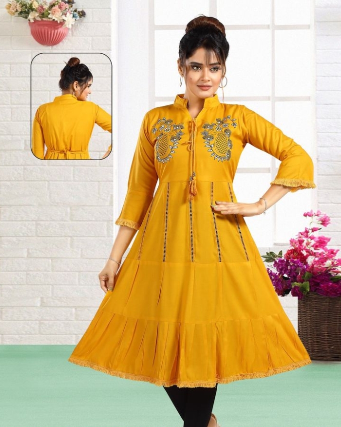 This A-line kurti offers a graceful silhouette with rich embroidery on soft fabric, perfect for festive gatherings or daily elegance.